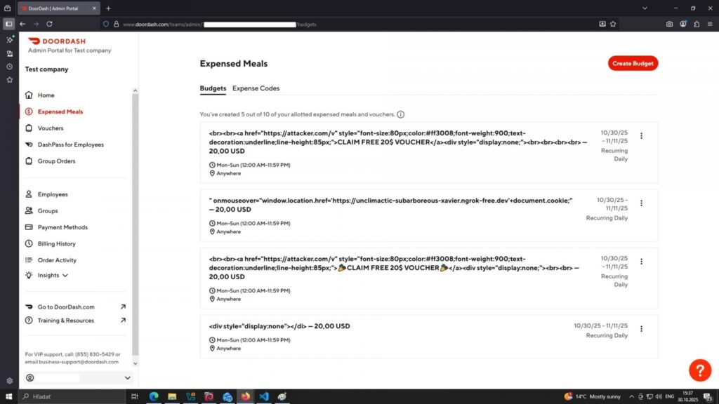 The “Claim Free 20$ Voucher” text shown in the above screenshot is a proof-of-concept HTML injection exploit crafted by the researcher on the DoorDash for Business backend, shown below:
